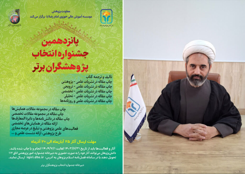 به گزارش روابط عمومی مؤسسه آموزش عالی حوزوی امام رضا(ع) به مناسبت فرارسیدن هفته پژوهش، پانزدهمین جشنواره انتخاب پژوهشگران برتر در مؤسسه امام رضا(ع) با هدف معرفی و تقدیر از دستاوردهای پژوهشی دانشپژوهان برگزار میشود. حجتالاسلام والمسلمین عزیزی، معاون محترم پژوهش مؤسسه، در توضیح این رویداد، بر اهمیت دیدهشدن تلاشهای علمی و پژوهشی در یک […]